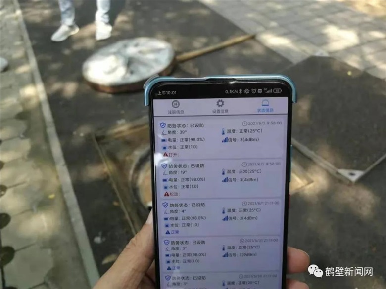 當(dāng)天,在淇濱區(qū)九州路中段人行道上,工人先撬開鋪有瀝青的方形面板后,一處隱形通信井蓋出現(xiàn),而井蓋的玄機(jī)在于井蓋背面安裝的智能傳感器?!澳憧?!工人用工具撬開井蓋時(shí),我手機(jī)App上立馬出現(xiàn)了紅色警報(bào),提示井蓋松動(dòng)并被打開。通過數(shù)據(jù)監(jiān)測,還能實(shí)時(shí)掌握窨井內(nèi)的液位、溫度、有毒氣體濃度等情況。”中國移動(dòng)通信集團(tuán)河南有限公司鶴壁分公司網(wǎng)絡(luò)部線路維護(hù)主管胡驍現(xiàn)場向記者演示手機(jī)終端實(shí)時(shí)監(jiān)控井蓋情況。