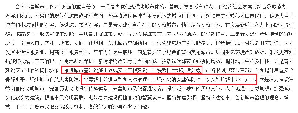 其中任務五是:著力建設安全可靠的韌性城市。推進城市基礎設施生命線安全工程建設,加快老舊管線改造升級;嚴格限制超高層建筑,全面提升房屋安全保障水平;強化城市自然災害防治,統(tǒng)籌城市防洪體系和內澇治理;加強社會治安整體防控,切實維護城市公共安全。