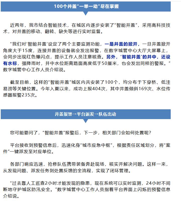 智能井蓋’設(shè)定了兩個主要監(jiān)測功能,一是井蓋的掀開,一旦井蓋掀開角度大于15度,連接井蓋的設(shè)備就會發(fā)出報警,在數(shù)字城管中心大廳大屏幕上,會同步出現(xiàn)紅色爆閃點,提示工作人員注意核查。另外,‘智能井蓋’的井中,還設(shè)有水標(biāo),強(qiáng)降雨時,井中水位距離路面高度低于50厘米,也會發(fā)出同樣的警報。”