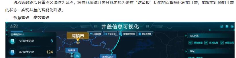井蓋,作為城市道路設(shè)施的一部分,承擔(dān)著重要的功能。為有效強(qiáng)化城市窨井蓋的安全可靠運(yùn)行、保障人民群眾的生命財(cái)產(chǎn)安全和城市管線功能正常運(yùn)轉(zhuǎn),清鎮(zhèn)市以“智慧城管”平臺為主要抓手,全面加強(qiáng)窨井蓋管理,試點(diǎn)先行智能井蓋。