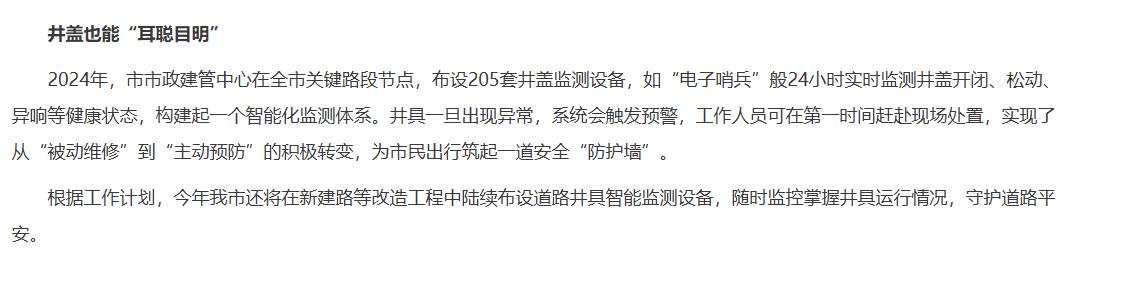為解決這些問題,多地已經(jīng)試點(diǎn)安裝智能井蓋,比如2024年,太原市市政建管中心在全市關(guān)鍵路段節(jié)點(diǎn),布設(shè)205套井蓋監(jiān)測設(shè)備,如“電子哨兵”般24小時實(shí)時監(jiān)測井蓋開閉、松動、異響等健康狀態(tài),構(gòu)建起一個智能化監(jiān)測體系。