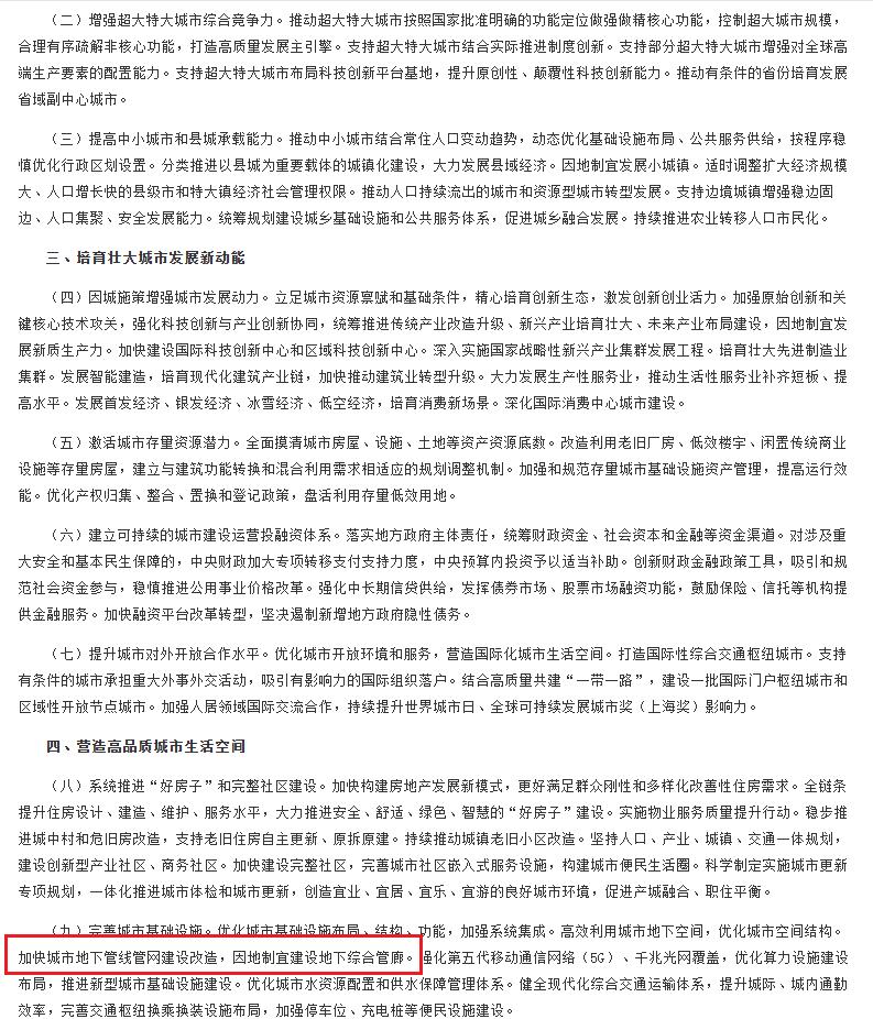 2025年8月28日,中國(guó)政府網(wǎng)發(fā)布的《中共中央 國(guó)務(wù)院關(guān)于推動(dòng)城市高質(zhì)量發(fā)展的意見(jiàn)》中提出,完善城市基礎(chǔ)設(shè)施。優(yōu)化城市基礎(chǔ)設(shè)施布局、結(jié)構(gòu)、功能,加強(qiáng)系統(tǒng)集成。高效利用城市地下空間,優(yōu)化城市空間結(jié)構(gòu)。加快城市地下管線管網(wǎng)建設(shè)改造,因地制宜建設(shè)地下綜合管廊。強(qiáng)化第五代移動(dòng)通信網(wǎng)絡(luò)(5G)、千兆光網(wǎng)覆蓋,優(yōu)化算力設(shè)施建設(shè)布局,推進(jìn)新型城市基礎(chǔ)設(shè)施建設(shè)。優(yōu)化城市水資源配置和供水保障管理體系。健全現(xiàn)代化綜合交通運(yùn)輸體系,提升城際、城內(nèi)通勤效率,完善交通樞紐換乘換裝設(shè)施布局,加強(qiáng)停車(chē)位、充電樁等便民設(shè)施建設(shè)。