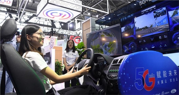 工作人員在智博會(huì)上演示“5G+遠(yuǎn)程駕駛”技術(shù)