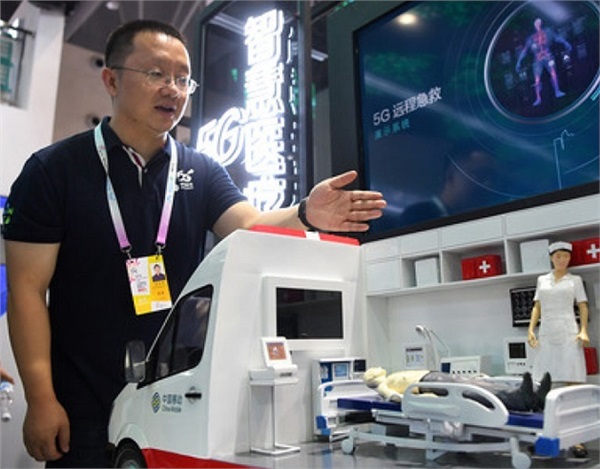 工作人員在智博會(huì)上介紹“5G智慧醫(yī)療”中的“5G遠(yuǎn)程急救”技術(shù)